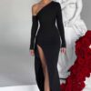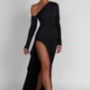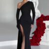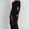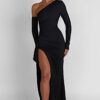 Elegant, glamorous, and timeless – these are the defining characteristics of Adrienne. Designed to steal the spotlight on any date night, this stunning dress is crafted from black stretch crepe, boasting an asymmetric neckline and one-sleeve styling. The allure is heightened with a thigh-high split and graceful drape detailing.