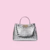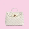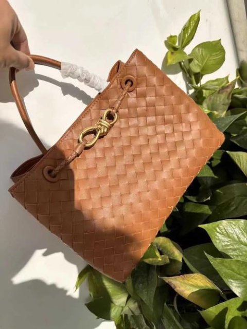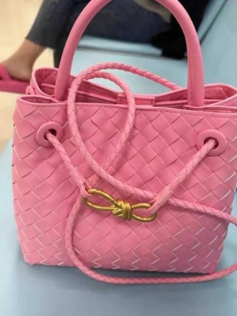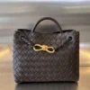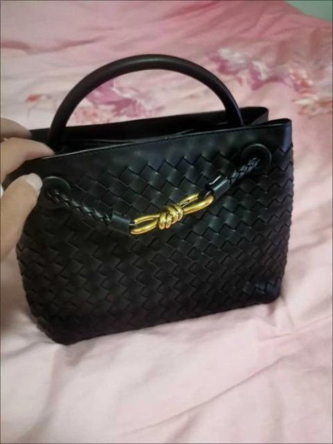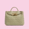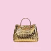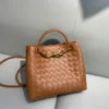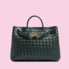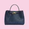 Introducing a sophisticated woven leather handbag that effortlessly combines style and functionality. This bag is crafted from premium leather with a unique, tightly woven design, giving it a luxurious yet understated look. The metallic hardware—a chic, gold-tone infinity knot—adds an elegant touch to the bag, highlighting its refined aesthetic.