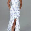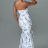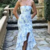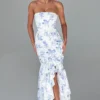 Step into your soft girl era with the Angelina Maxi Dress, a vision of elegance and charm. Crafted from a premium cotton blend, this strapless silhouette contours the body with structured seams and internal boning for a flattering fit. The voluminous frilled skirt, enhanced with delicate tulle, adds playful movement with every step, while a chic high-low hem and thigh split create the perfect balance of romance and modern allure. Finished in a dreamy blue floral print, this dress is made for garden parties, weddings, and unforgettable evenings.