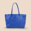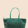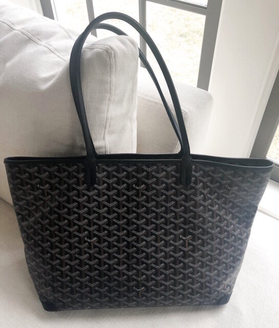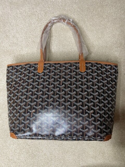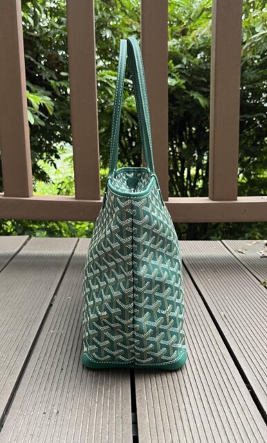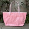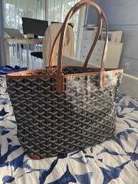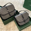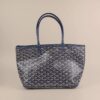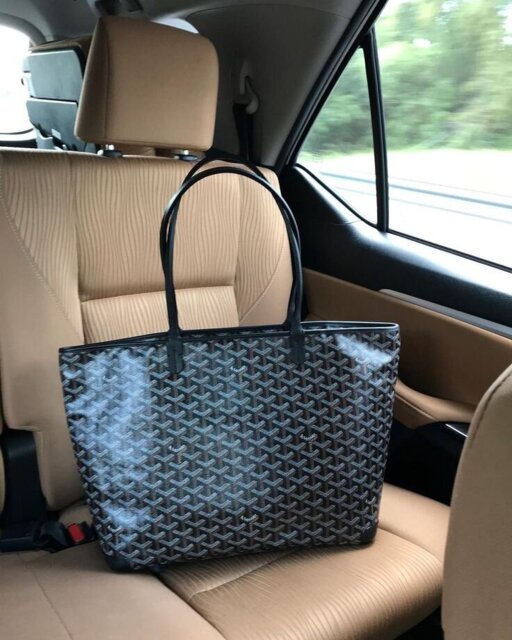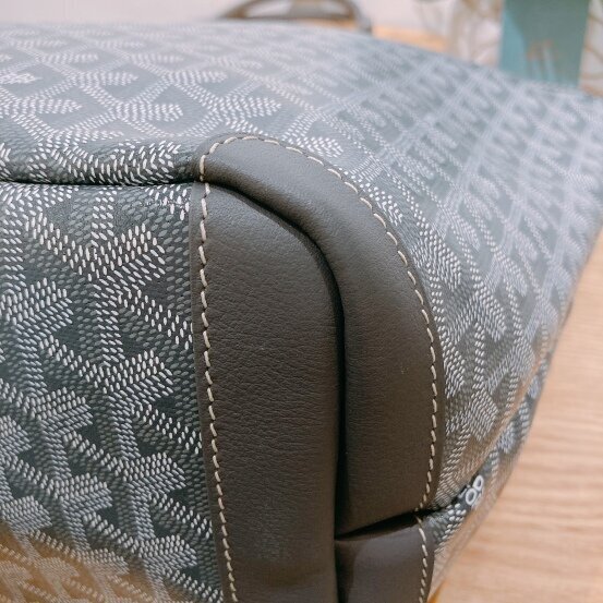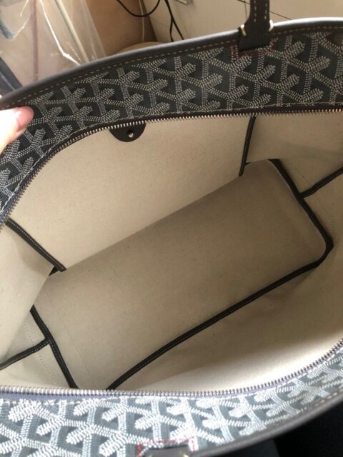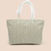 This is a high-quality Goyard-inspired Artois PM dupe in Grey, designed with the iconic chevron pattern and original-style logos. It features premium coated canvas, grey trim, strap handles, and protective corner accents. The silver-toned top zipper opens to a spacious off-white interior with a natural canvas lining and a matching chevron-patterned patch pocket. A stylish and practical alternative for those who appreciate classic elegance.