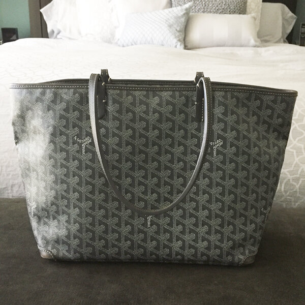 Crafted in premium coated canvas with the signature chevron pattern, this elegant dupe features grey trim, sturdy strap handles, and protective corner accents. The silver-toned zipper opens to a spacious off-white canvas-lined interior with a matching chevron patch pocket—stylish, practical, and timeless.