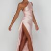 Feel like the goddess you are in Aurora, our premium gown made from luxury, lightweight satin with a stretch to hug your curves. With draped detailing and one shoulder design, the maxi dress sweeps the floor and is complete with a thigh high split.