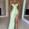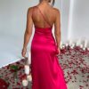 The thigh-high split adds a touch of allure, and the thin, adjustable back strap ensures a perfect fit. Style with sleek hair, heeled mules, and a mini bag for an unforgettable statement look.