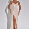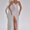 The dress features a cupped bust, backless design with tie-detail straps, and a thigh-high split, combining elegance with a touch of allure. Perfect for formal events, parties, or any occasion where you want to make a statement.