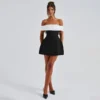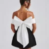 Elegance meets playfulness in the Camille Dress — a striking monochrome mini designed to steal the spotlight. This off-shoulder stunner features a structured sweetheart neckline with a wrapped satin-style bodice that flows into a voluminous A-line skirt. The highlight? A dramatic oversized bow cascading down the back, adding a dash of whimsical flair to your evening ensemble. Ideal for cocktail parties, holiday soirees, or glamorous nights out.
