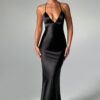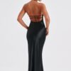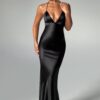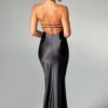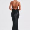 The silhouette is defined by a plunge halter neckline, drawing the eye with graceful lines, while the back reveals the gown’s most captivating detail—a super low scoop cut adorned with delicate elastic strap accents for subtle allure. A discreet hook closure at the neck and invisible zipper at the reverse ensure a seamless, refined finish.