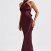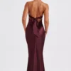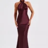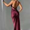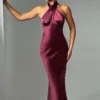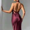 Indulge in luxury with Diana, an exquisite maxi dress meticulously crafted from delicate satin, boasting a lustrous sheen and irresistibly soft texture. With its high crossover neckline and captivating low back adorned with tie detail, this design exudes sophistication. Accentuated by shaped piping under the bust, it offers a flattering fit and flare silhouette. Elevate your look with minimalist heels and sleek hair for a chic finish.