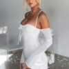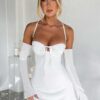 Step into effortless elegance with the Fiona Mini Dress, crafted from delicate, lightweight chiffon that skims the figure beautifully. Featuring off-the-shoulder styling with long, flared sleeves, this mini exudes romantic charm, while the halter straps that cross over the back create a striking plunging back detail.