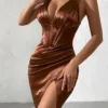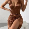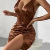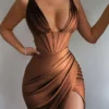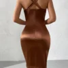 This elegant coffee brown bodycon dress features a deep V-neck and a sleeveless design, perfect for various occasions including parties, weddings, and beach outings. Its plain yet stylish criss-cross detailing and high-waist cut complement its slim fit, making it a versatile choice for any season. Ideal for gifting, this dress suits women across all ages.