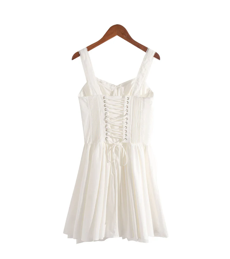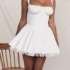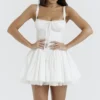 Indulge in romantic evenings with our enchanting Jasmine Mini Dress. Crafted from a luxurious cotton blend, it features delicate lace trims adorning the bodice and skirt. The oversized bow detail at the back adds a playful touch, while the boned bodice ensures a flattering silhouette.