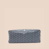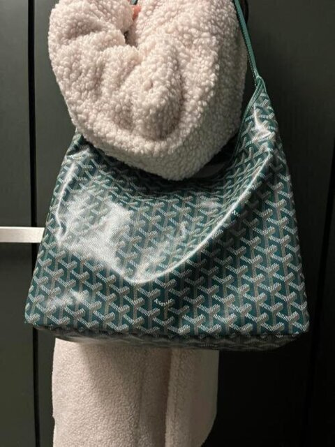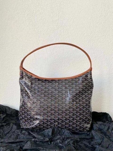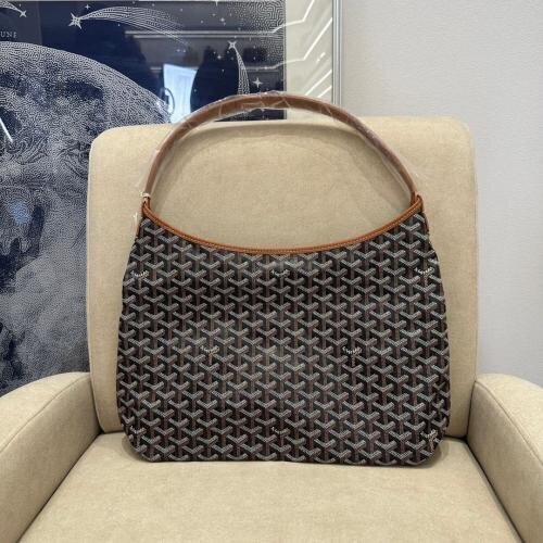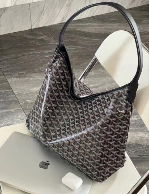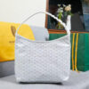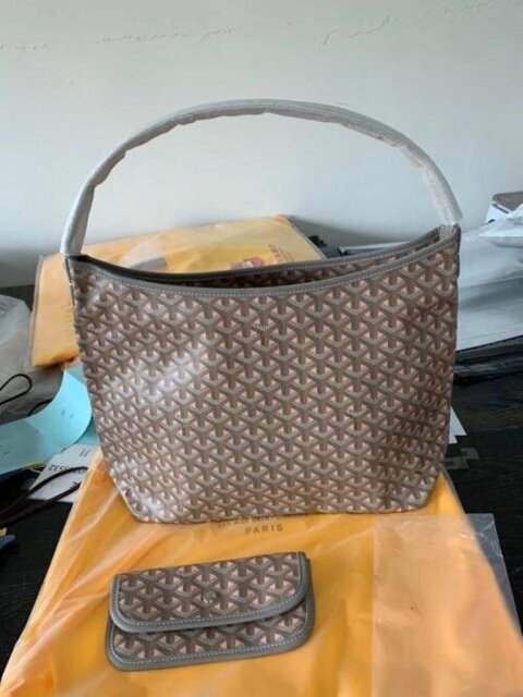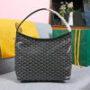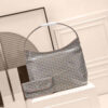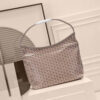 This is a dupe of the GOYARD Goyardine Boheme Hobo in Grey. It is meticulously crafted from high-quality materials, featuring the iconic chevron monogram pattern on Goyardine-style coated canvas. The bag includes a leather-like shoulder strap, coordinating trim, and silver-tone hardware. The top zipper opens to a spacious interior made from natural canvas fabric, complete with a matching removable pouch.