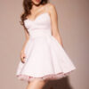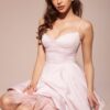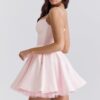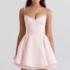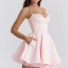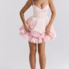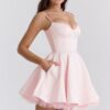 This enchanting creation embodies the essence of Ballerina. Featuring a structured bodice with boning for a defined waist, it boasts a charming sweetheart neckline with underwired cups. The adjustable delicate straps ensure a perfect fit, while the floaty mini skirt is adorned with voluminous layers of soft tulle, maintaining its shape gracefully.