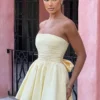 - Strapless ruched corset design.