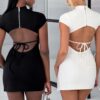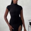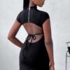 The high neckline and short sleeves strike a polished, contemporary balance, offering just the right amount of coverage while keeping the look sleek. From the front, the vibe is refined and minimalist, but the back tells a different story. A bold cut-out back with tie detailing adds intrigue and sophistication, transforming the Mila mini into a true statement piece.