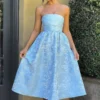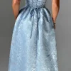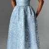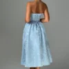Designed to be your go-to dress year-round, the Sienna Midi Dress is crafted from our most exquisite floral jacquard fabric. Its midi length and super full skirt, lined with tulle for added volume, create a striking silhouette. The strapless style features boning in the bodice for a cinched waist, along with pleating and gathered detailing for a touch of elegance. Complete with a lace-up back, this dress is perfect for any occasion. Pair it with pointed heels and an updo for a chic look that’s sure to turn heads.