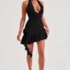 The super-plunge cowl neckline draws the eye to the bust, framed by a chic halterneck that feels both sultry and secure. A statement corsage flower detail blooms at the waist, leading into a floaty, frilled skirt with an asymmetric hem. To one side, cascading ruffles fall dramatically, giving movement and flair with every step.