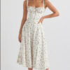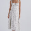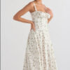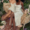 Experience the essence of femininity with our ‘Tiana’ dress, an ideal choice for Spring and Summer events. Crafted from stretch cotton-rich fabric featuring a delightful vintage print, this dress boasts a corseted bodice and a lace-up back to enhance your silhouette. The design includes a gathered bust with a drawstring tie and a side split that subtly showcases your leg.